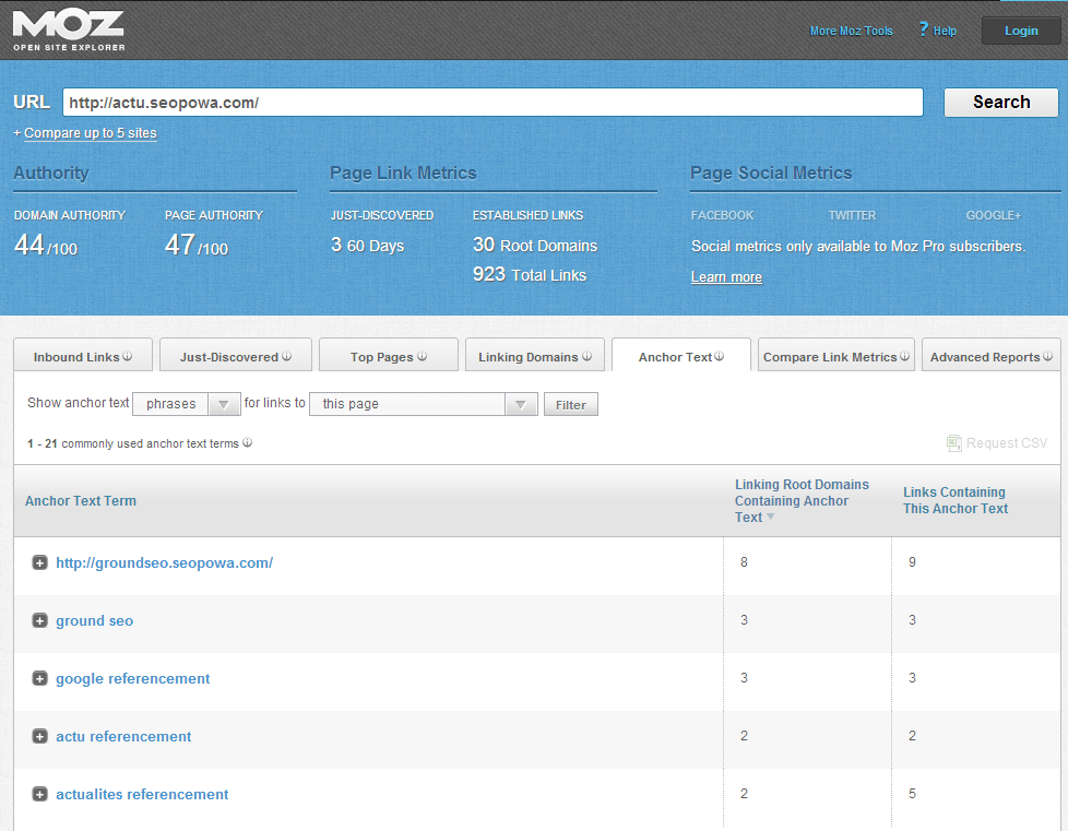 Open Site Explorer, pour connaitre les mots clés de vos concurrents, entrez l’url du concurrent, puis allez sur l’onglet “anchor text”.