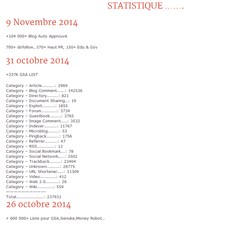 Vous utilisez des Logiciel tel que Money Robot, Senuke, Gsa, Scrapebox … Ne vous prenez plus la tête à scrapper des sites mais utilisez nos listes premium. Vous n’avez plus qu’a vous focaliser sur la mise en place de la campagne!